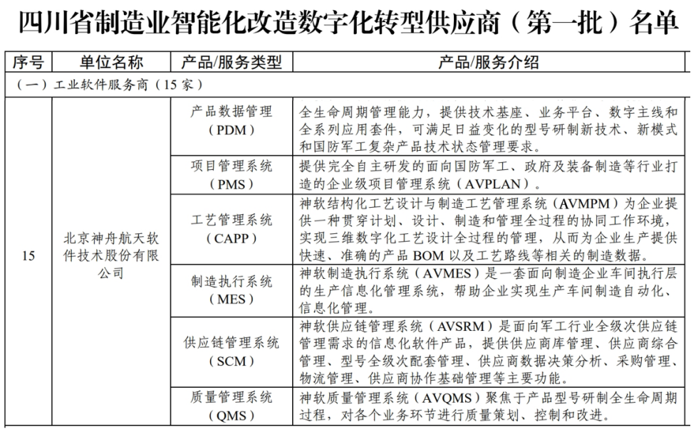 首批供應(yīng)商的遴選條件,主要包括企業(yè)營(yíng)收規(guī)模、專業(yè)資質(zhì)、屬地化服務(wù)能力、產(chǎn)品或服務(wù)領(lǐng)先性等基本條件,同時(shí)要求近三年獲得過國(guó)家級(jí)試點(diǎn)示范相關(guān)榮譽(yù),并在制造領(lǐng)域已有一批成功實(shí)踐案例。經(jīng)過企業(yè)申報(bào)、審核推薦、形式審查、意見征求等程序,神軟公司憑借自研的產(chǎn)品數(shù)據(jù)管理系統(tǒng)PDM,項(xiàng)目管理系統(tǒng)PMS、工藝管理系統(tǒng)CAPP、制造執(zhí)行系統(tǒng)MES、供應(yīng)鏈管理系統(tǒng)SCM、質(zhì)量管理系統(tǒng)QMS等工業(yè)軟件產(chǎn)品成功入選。