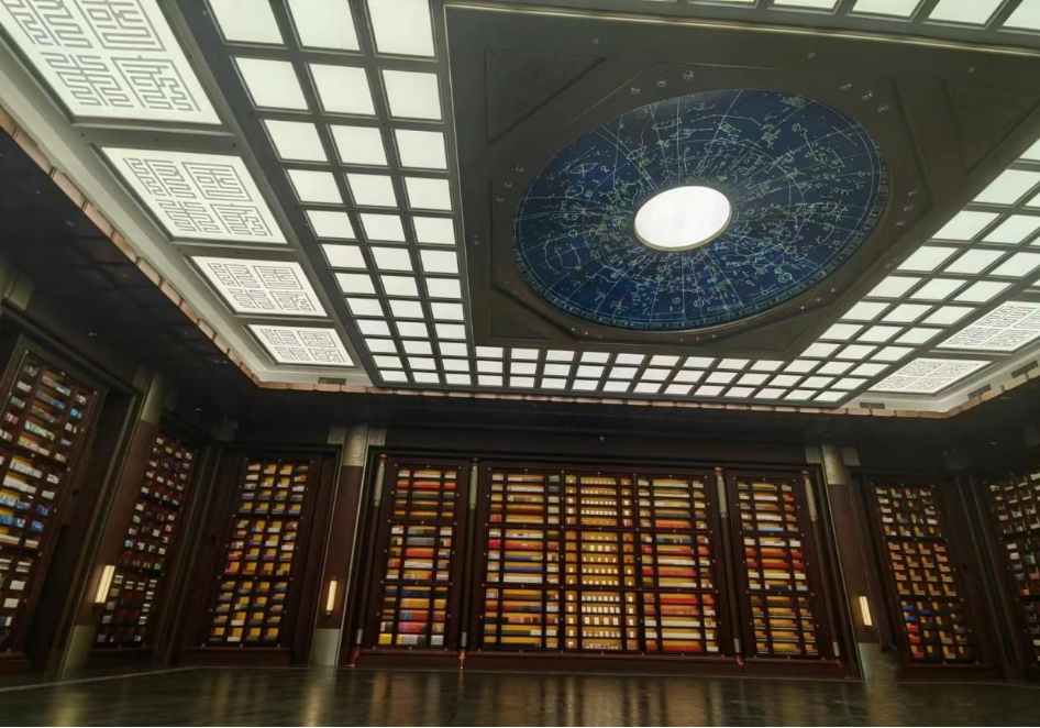 在主建筑文華堂,穹頂之上,取自宋代石刻天文圖的滿天星宿點(diǎn)綴其中,寓意中華文明如星空般浩瀚璀璨。環(huán)視四周,15組書(shū)柜、3萬(wàn)余冊(cè)古今經(jīng)典匯成文山字海,彰顯厚重文化底蘊(yùn)。