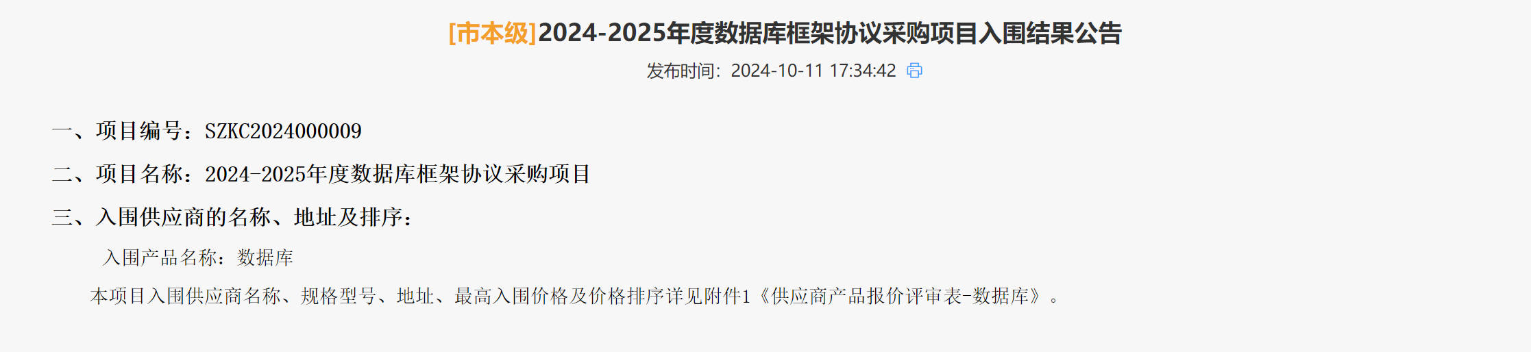 近日,深圳政府采購業(yè)務(wù)框架協(xié)議采購系統(tǒng)公布了《2024-2025年度數(shù)據(jù)庫框架協(xié)議采購項目》入圍結(jié)果公告,神通數(shù)據(jù)庫成功入圍。