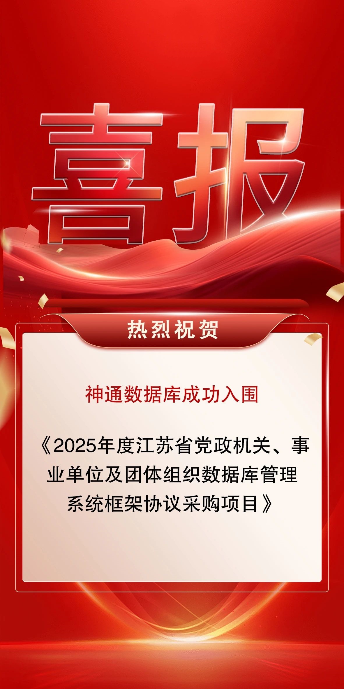 喜訊 神通數(shù)據(jù)庫入圍2025年度江蘇省黨政機關、事業(yè)單位及團體組織數(shù)據(jù)庫管理系統(tǒng)框架協(xié)議采購項目